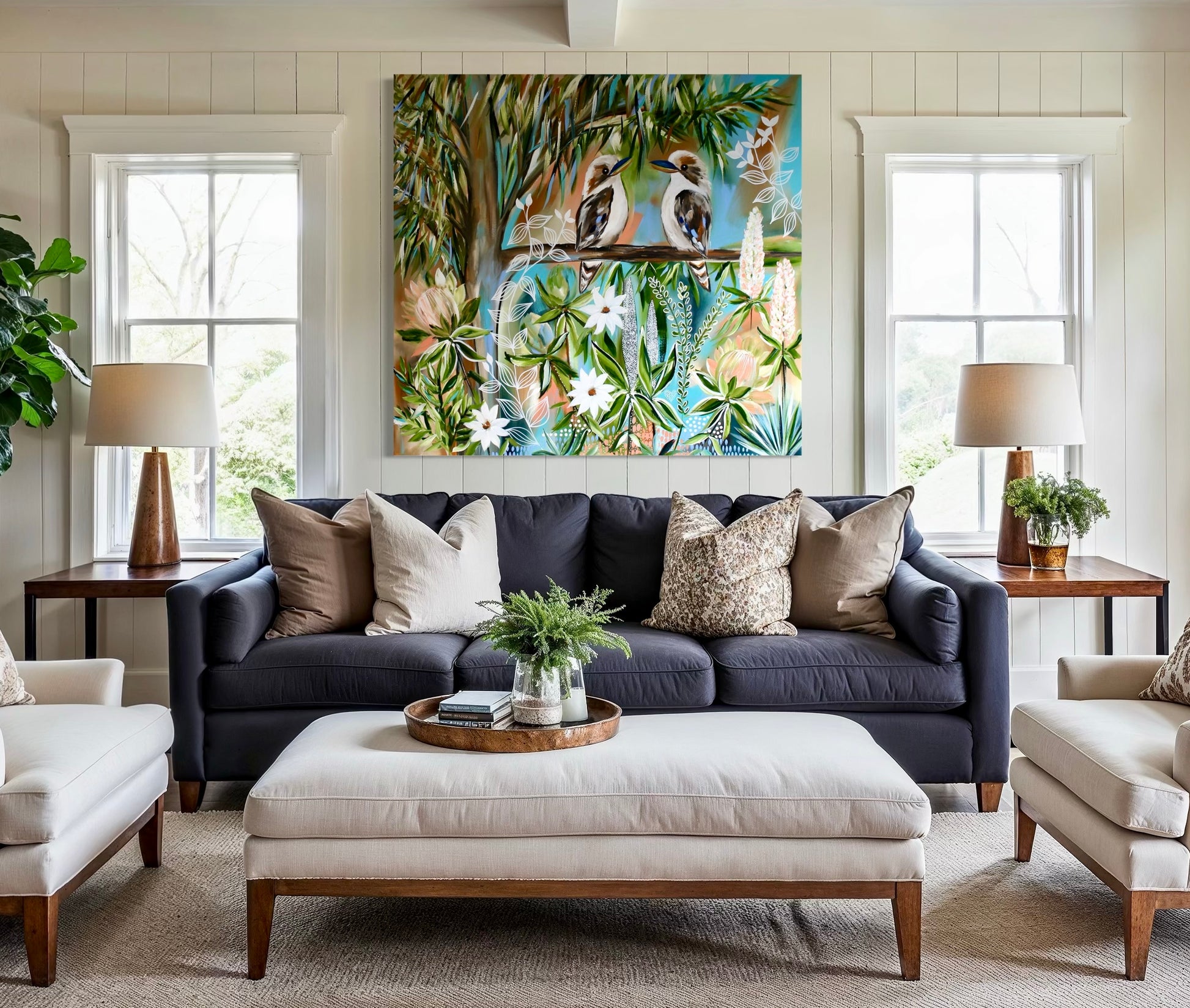 Step into the heart of the Aussie bush with Bushland Laughter, a joyful original artwork featuring two kookaburras perched beneath the soft dappled light of native gums. This playful pair is surrounded by a lush tapestry of Australian flora — including white flowering blossoms, proteas, and delicately layered botanical textures.