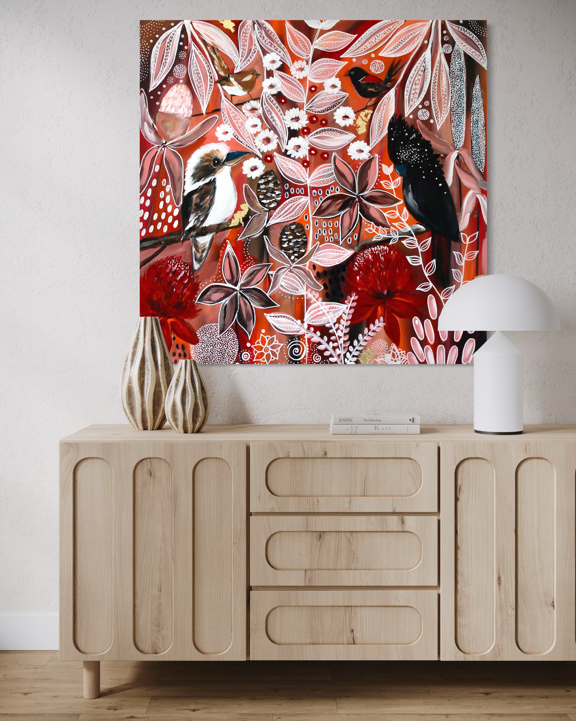 Infuse your home with the warmth and vibrancy of the Australian bush with Crimson Bush Chorus, a richly layered original artwork celebrating native birdlife and botanical beauty.