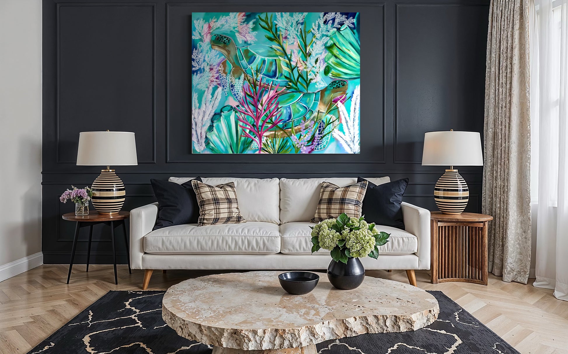 Transform your space with this mesmerizing ocean-inspired painting that celebrates the grace and mystery of sea turtles gliding through a reef garden. Drift Beneath the Coral Veil brings to life the serenity of underwater beauty with vivid aqua tones, lush coral textures, and delicate marine foliage.