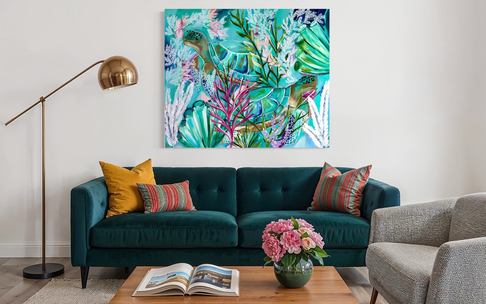 Original Handcrafted Design: A one-of-a-kind creation capturing the peaceful movement of turtles amongst coral and sea plants, rich in colour and layered detail.