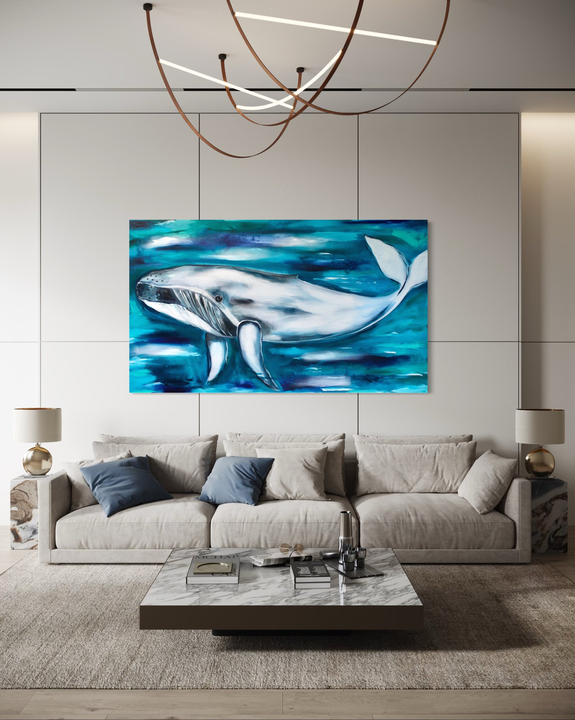 Transform your space with this breathtaking original painting, Gentle Giant of the Deep — a tribute to the grace and majesty of the humpback whale. Bathed in luminous turquoise and indigo tones, the whale glides effortlessly through tranquil waters, its form captured with soft movement and depth.