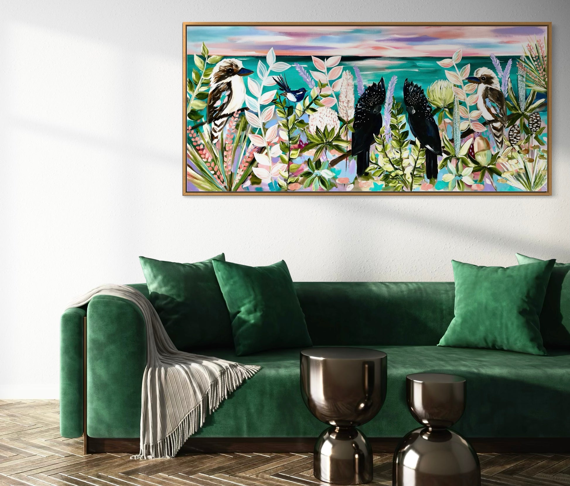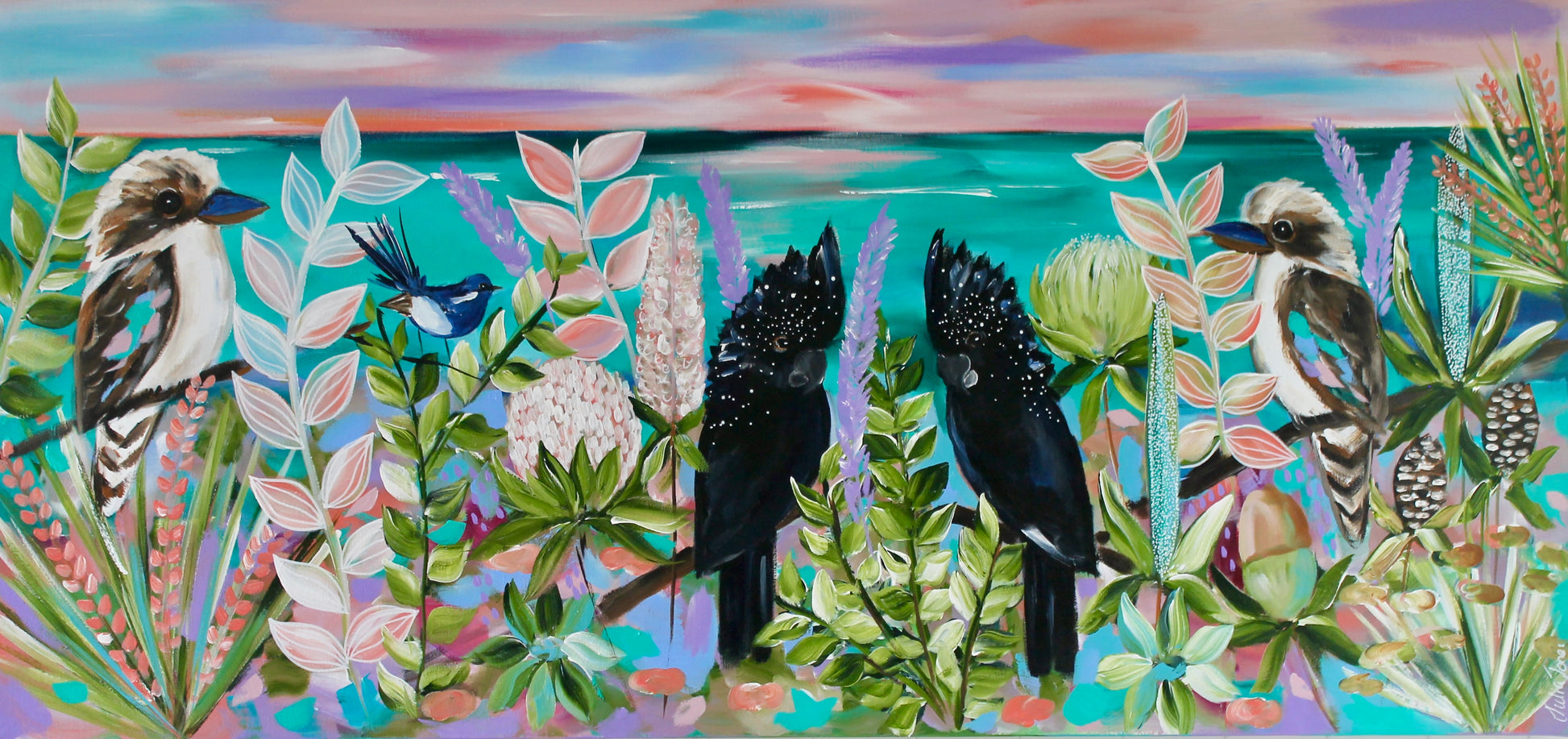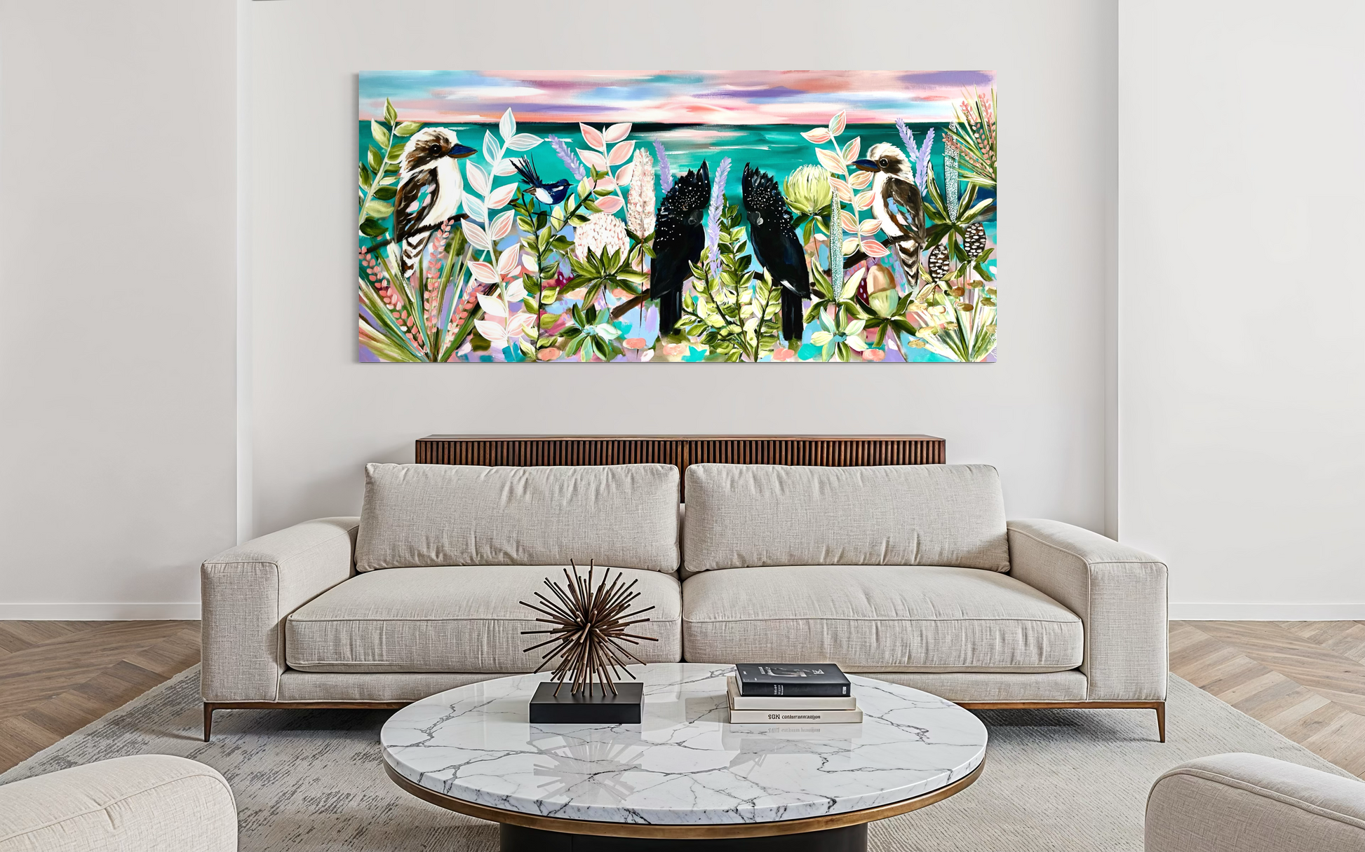 Measuring 1500mm x 700mm, this expressive painting captures a lively gathering of iconic native birds nestled amongst flourishing botanicals and coastal foliage. Two striking black cockatoos take centre stage, their dark silhouettes creating a beautiful contrast against the surrounding bursts of colour. On either side, kookaburras perch watchfully while a bright little fairy wren flits among the leaves, bringing movement and life to the scene.