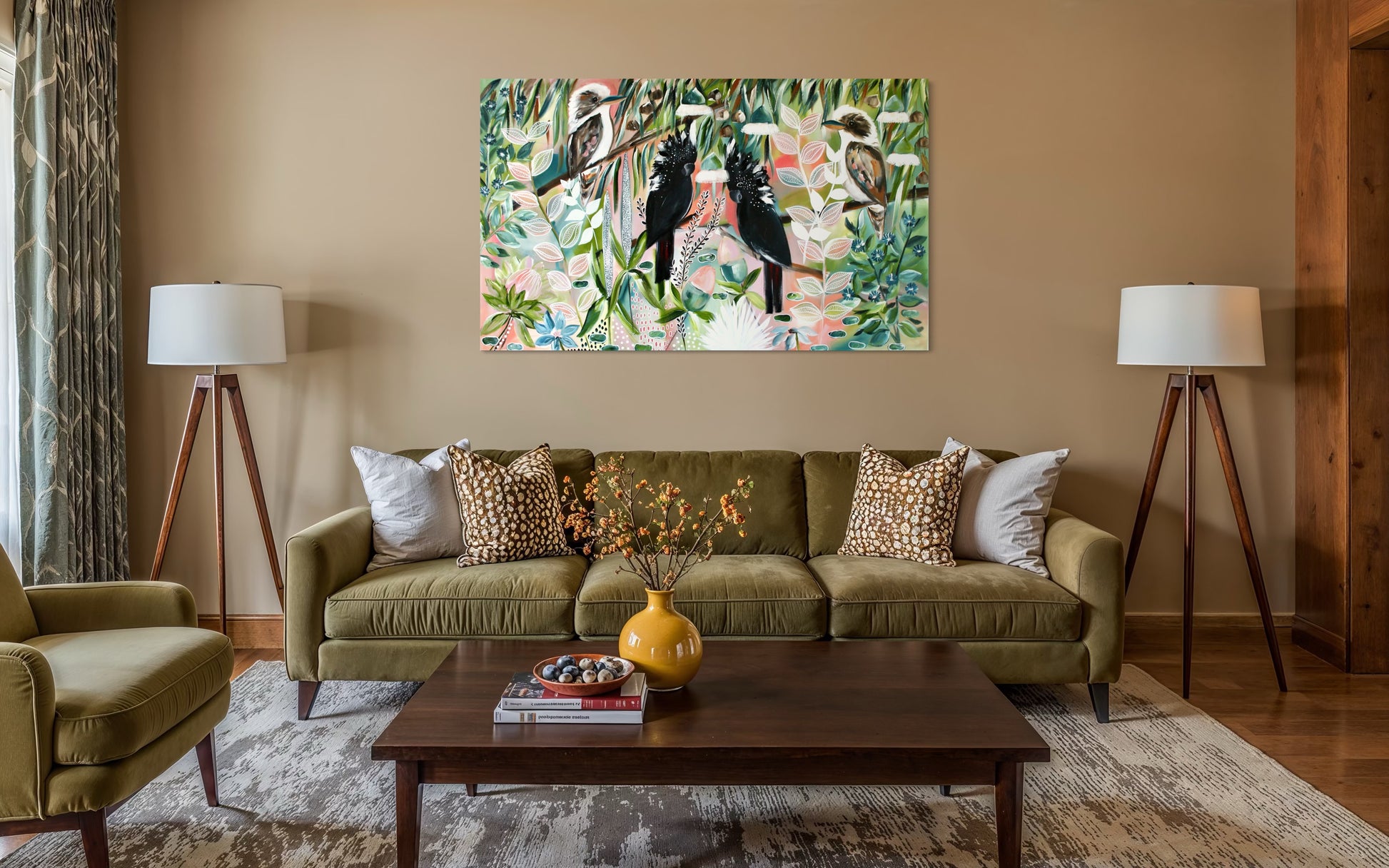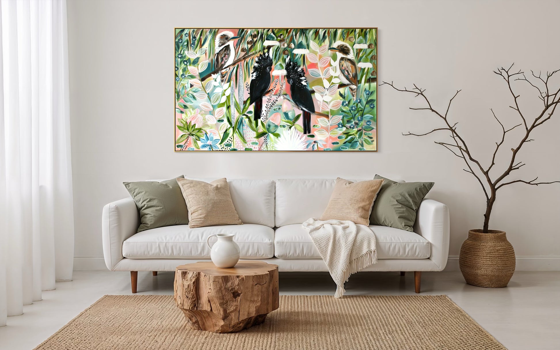This artwork tells a story of connection to country — of watchful keepers resting high in the canopy, protecting and observing the bush below. A statement piece that brings an unmistakable Australian spirit into any space, perfect for coastal, contemporary or nature-inspired interiors.