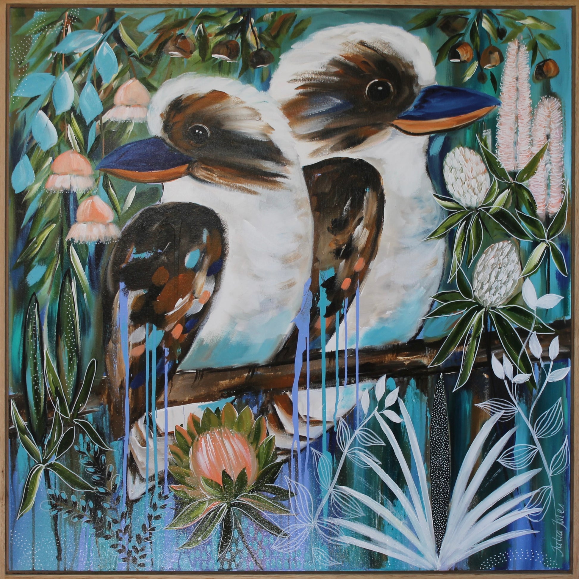 Celebrate the gentle bond of the bush with Kindred Spirits, an original painting that captures two kookaburras nestled side by side in their native surrounds. With their iconic blue beaks and warm, earthy feathers, these beloved birds exude both strength and softness—symbolizing companionship and the quiet joy of togetherness.