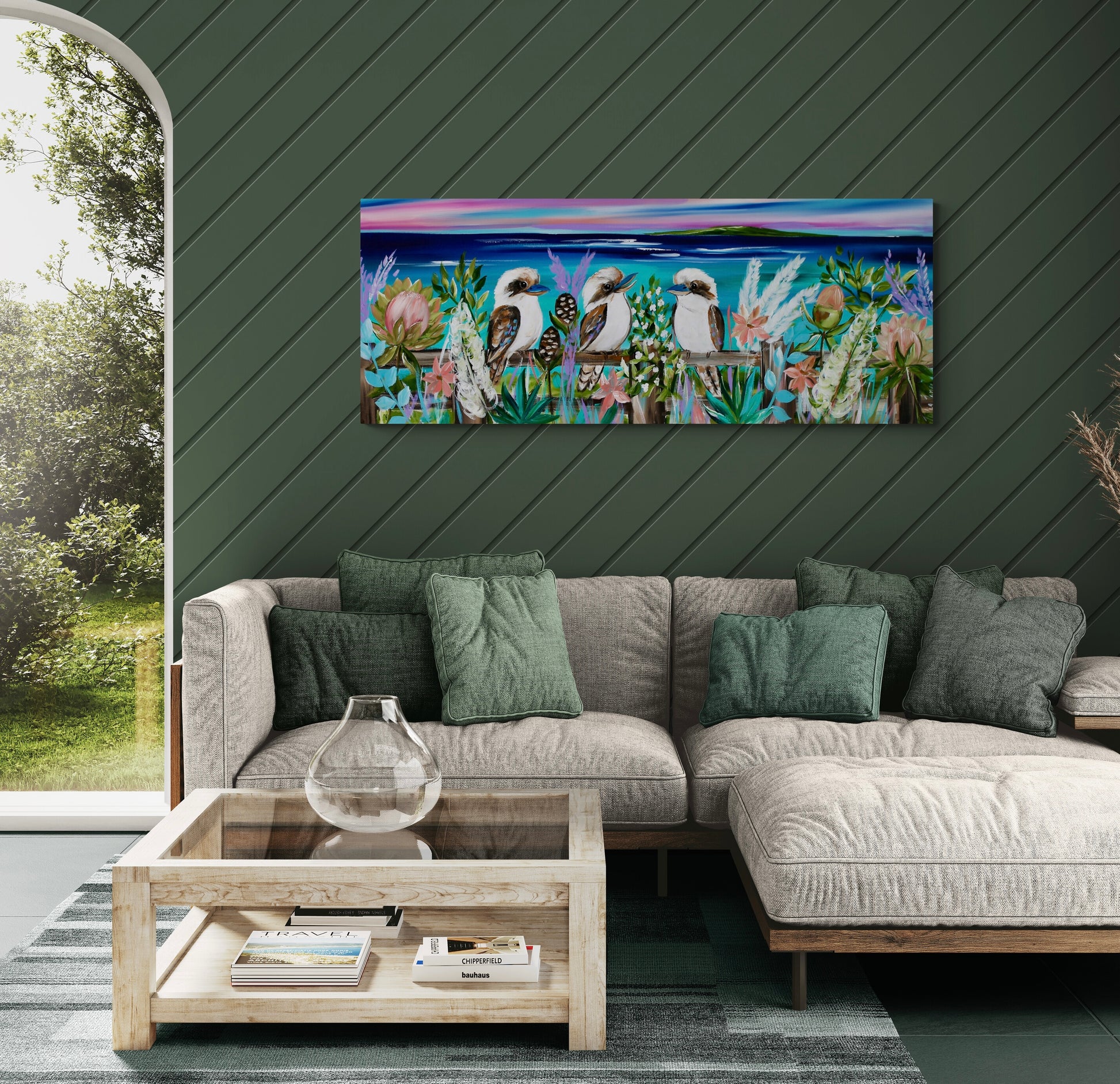 Design: Three kookaburras set among native blooms with a coastal vista.