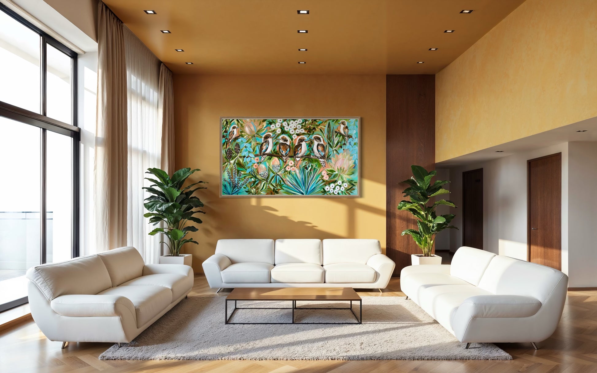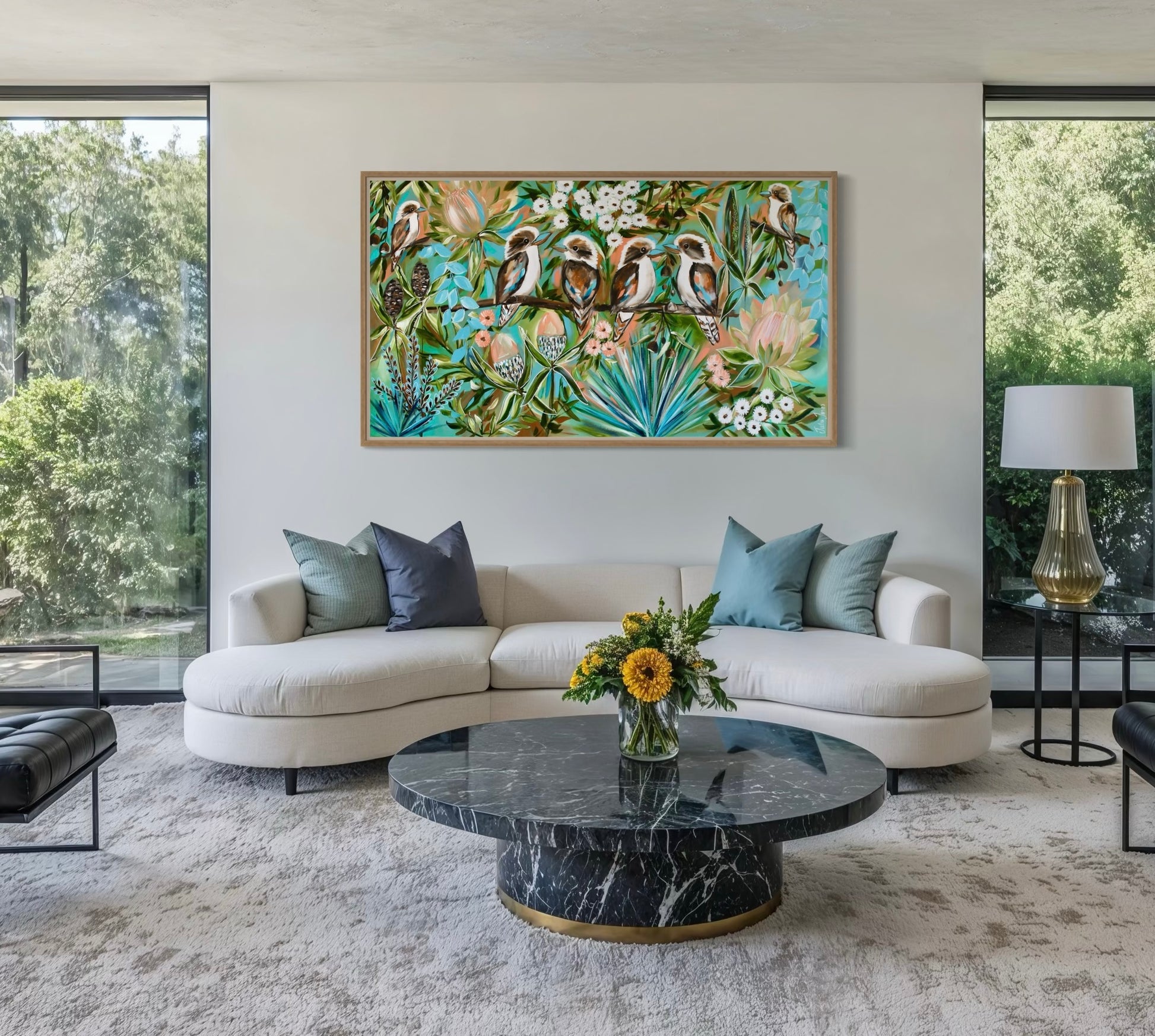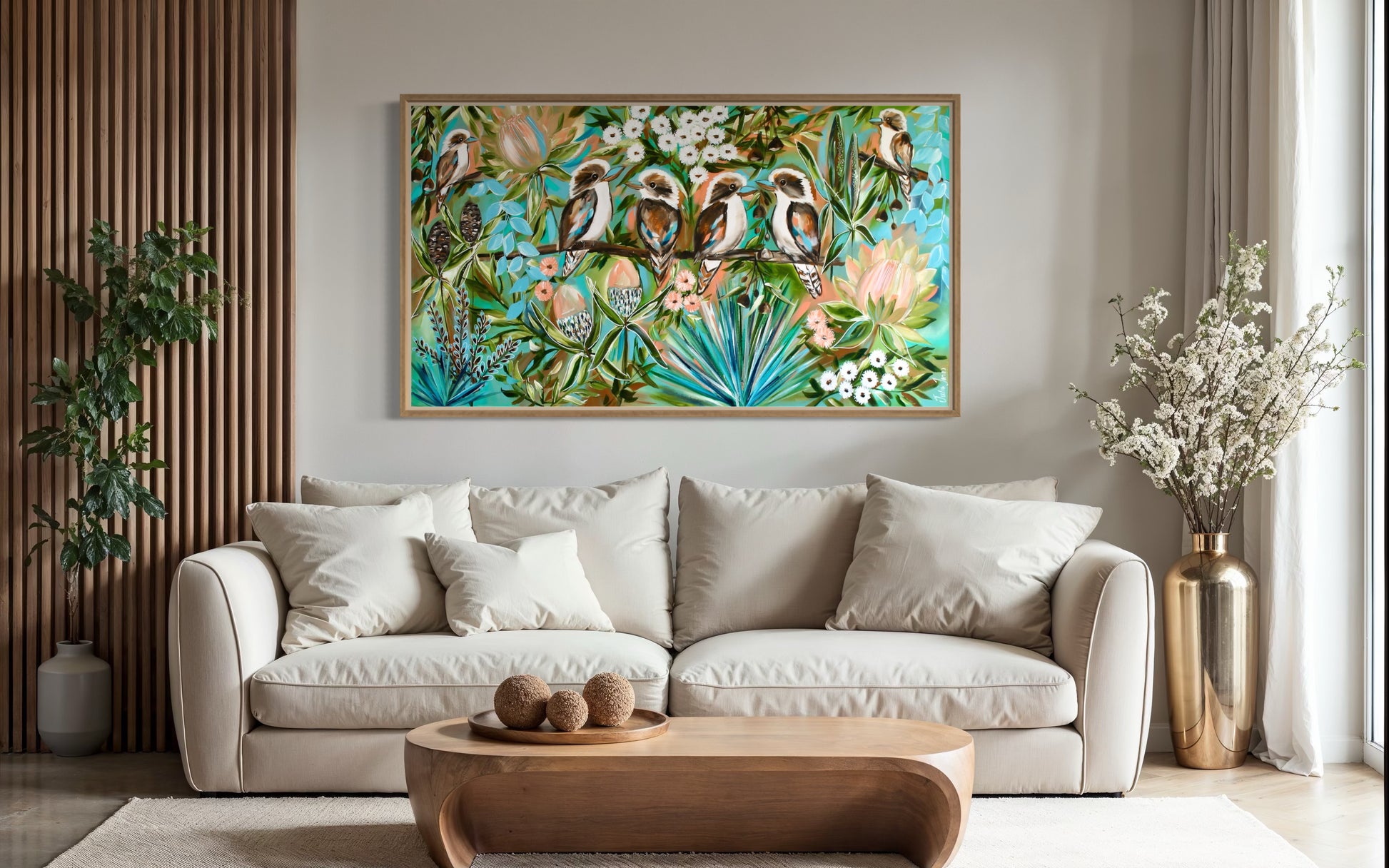 With a palette of fresh blues, soft greens, and warm natural tones, this piece brings both colour and calm into any space. A celebration of Australian wildlife and floral beauty, designed to bring harmony, connection, and a touch of the bush indoors.