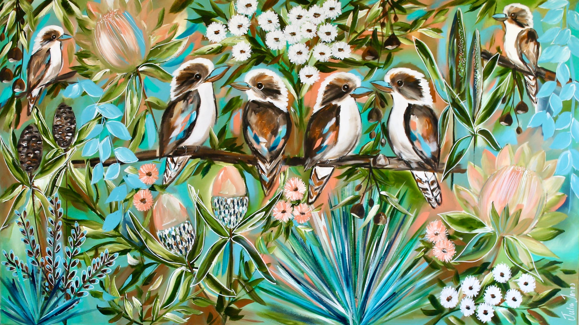 A curious gathering of kookaburras sits perched amongst a vibrant field of native Australian blooms, quietly observing the world around them. Kookaburra Watchers captures the playful charm and gentle presence of these iconic birds, surrounded by rich botanicals including proteas, eucalyptus, gum blossoms, and native foliage.