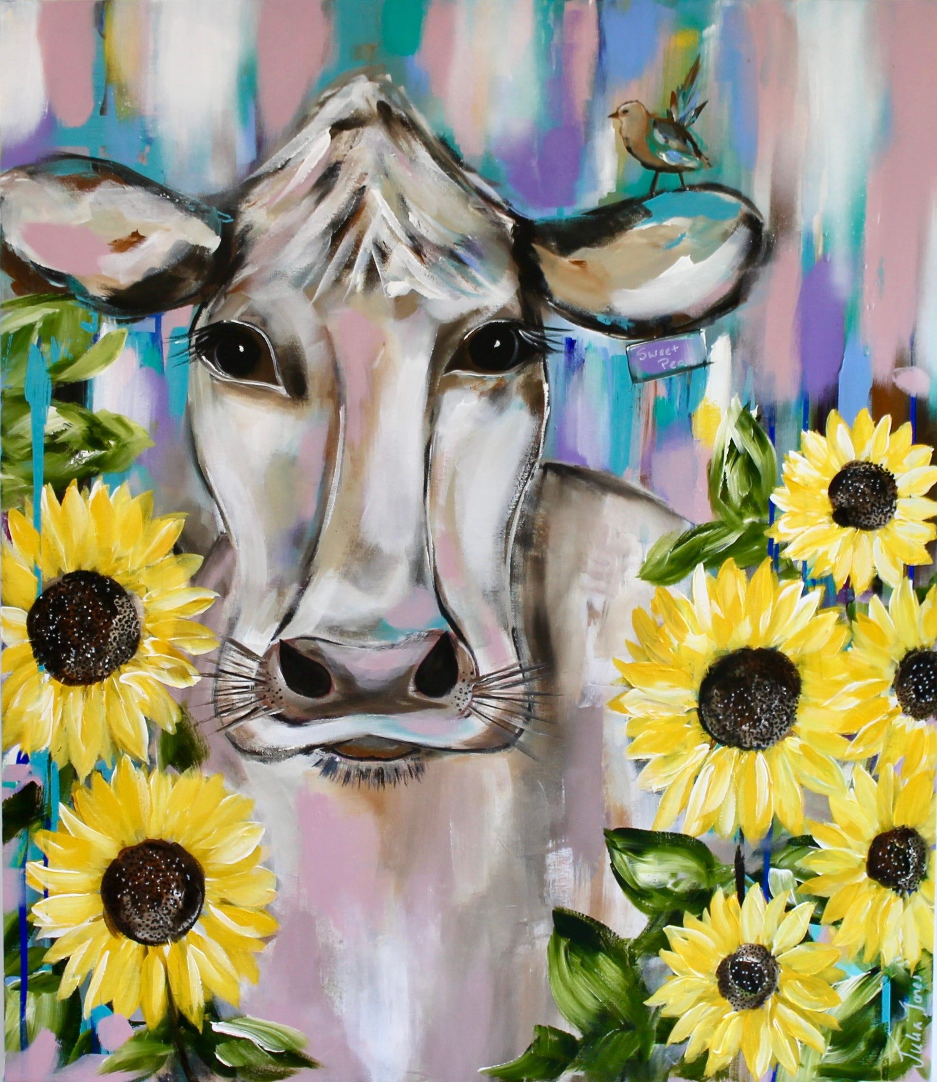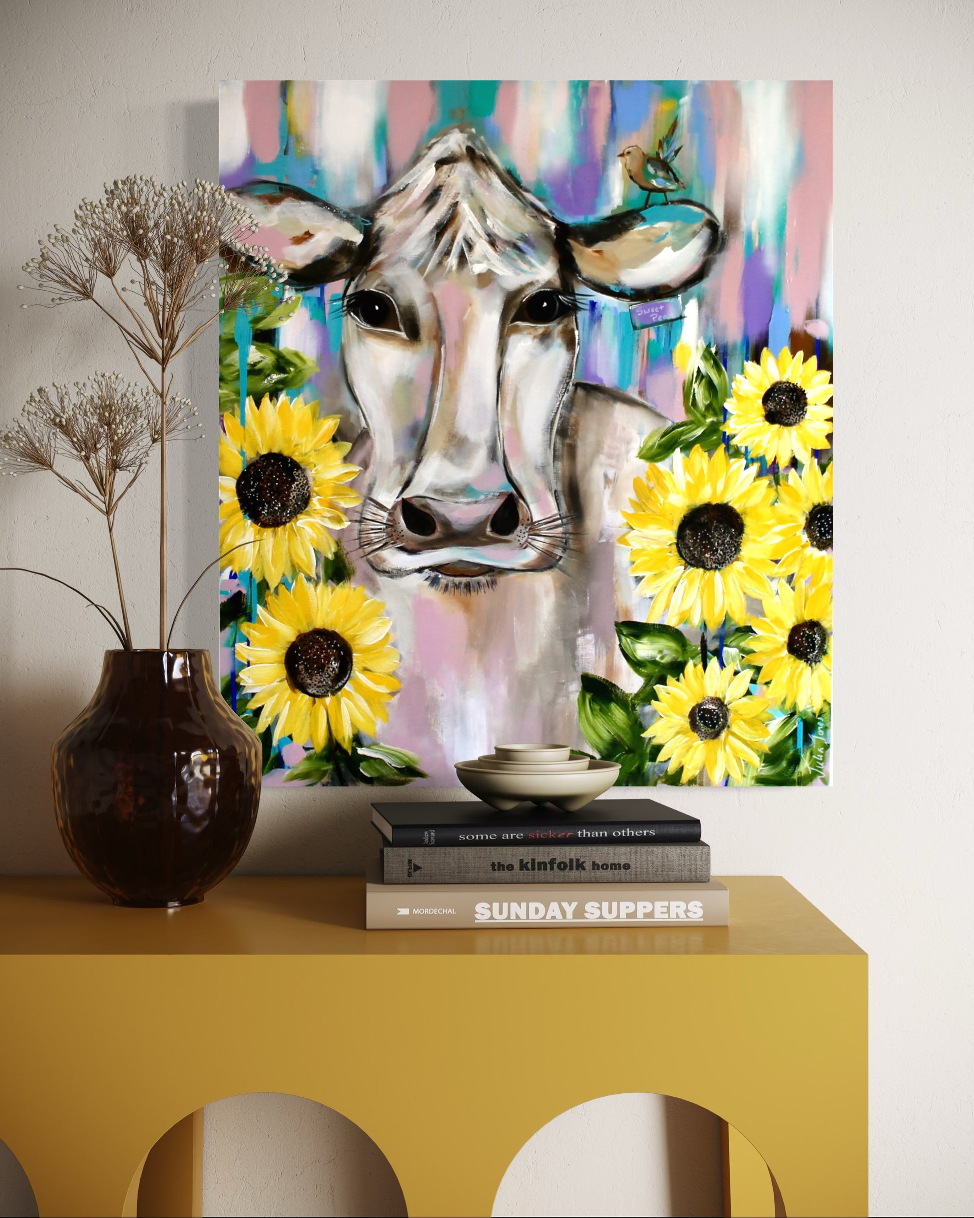 A curious cow named Sweet Pea gazes softly from the canvas, framed by radiant golden sunflowers that burst with warmth and optimism. Perched upon one ear, a tiny bird adds a playful touch, symbolising harmony between nature’s creatures. The background, alive with sweeping strokes of pastel pinks, aquas, and lilacs, infuses the piece with movement and modern vibrancy. Expressive brushwork and layered colour create a sense of depth, while Sweet Pea’s soulful eyes draw the viewer into a serene moment of stillness and joy.