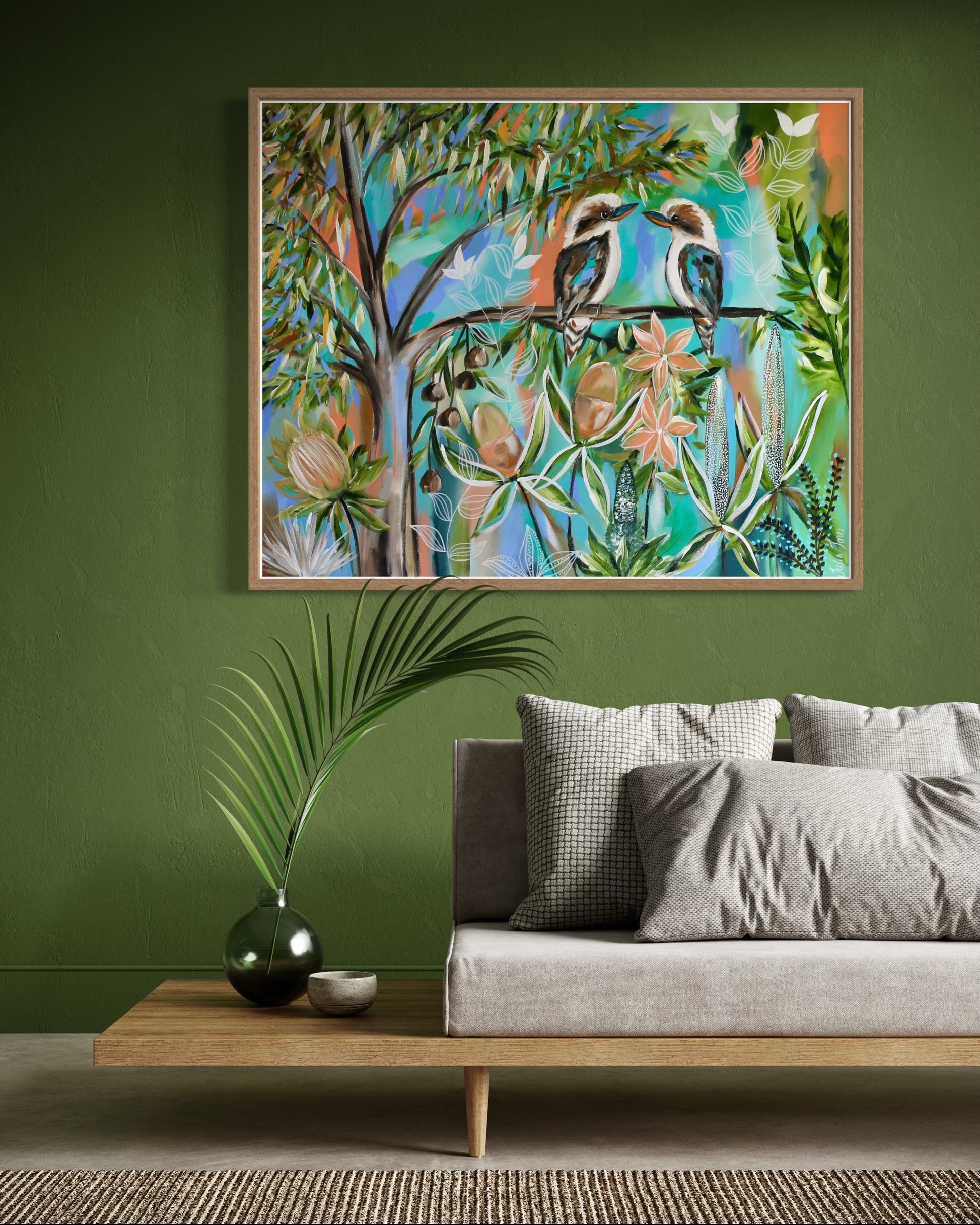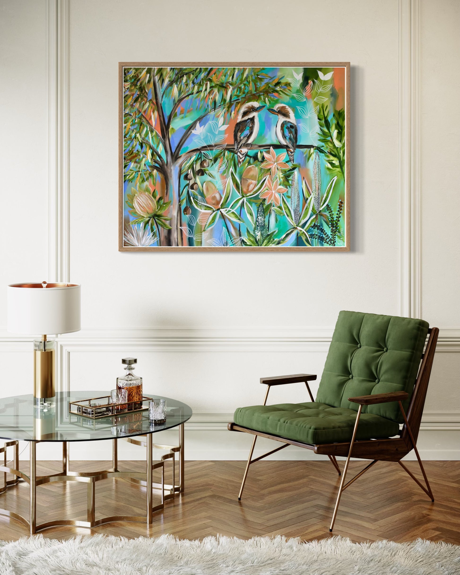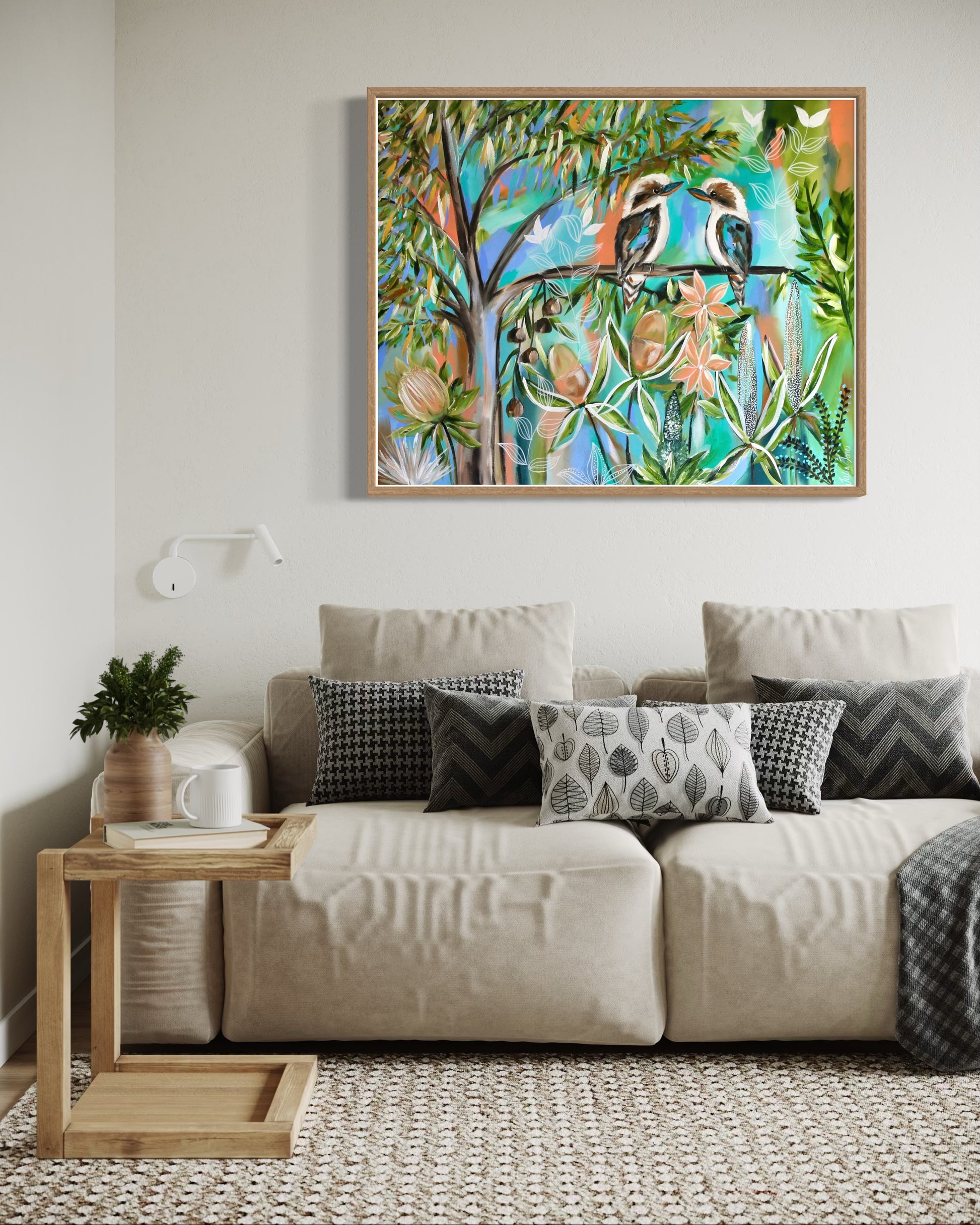 Transform your space with this heartwarming original painting featuring two kookaburras perched together amongst a lush tapestry of native flora. Gentle hues of aqua, green, and coral intertwine with soft whites and warm browns, capturing the peace and connection of life in the Australian bush.
