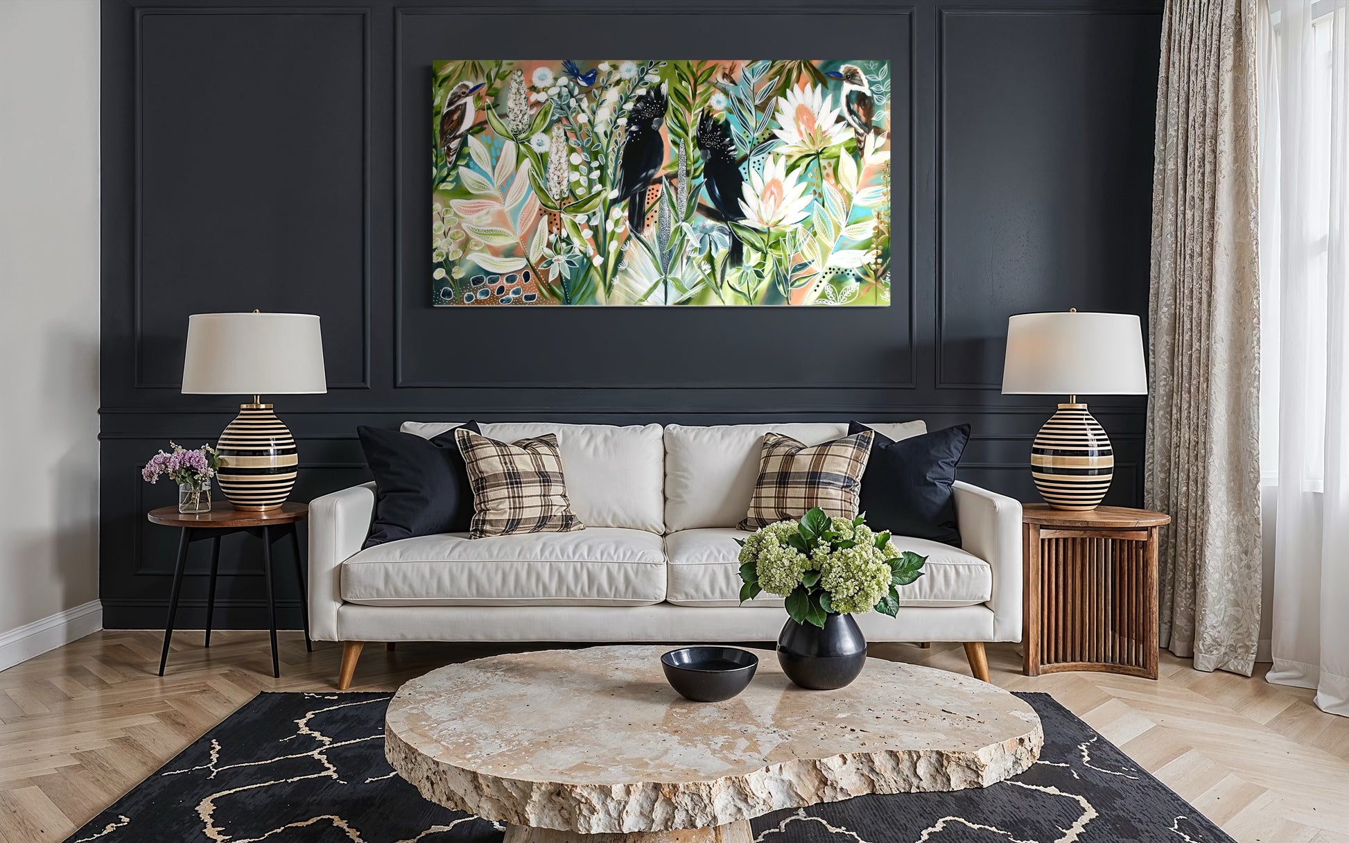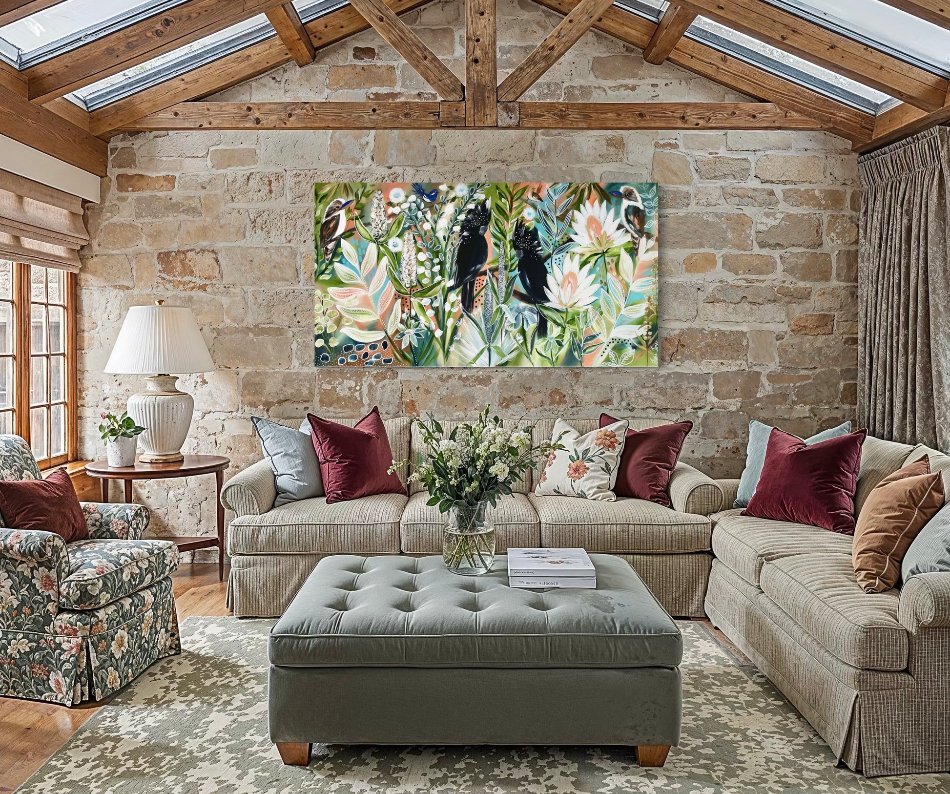 Lush layers of eucalyptus greens, warm earthy tones and delicate pastel highlights sweep across the canvas, framing the elegant silhouettes of the black cockatoos as they perch among blooming wildflowers. Each brushstroke adds depth and texture, capturing the spirit, beauty and mystery of these gentle giants of the sky.