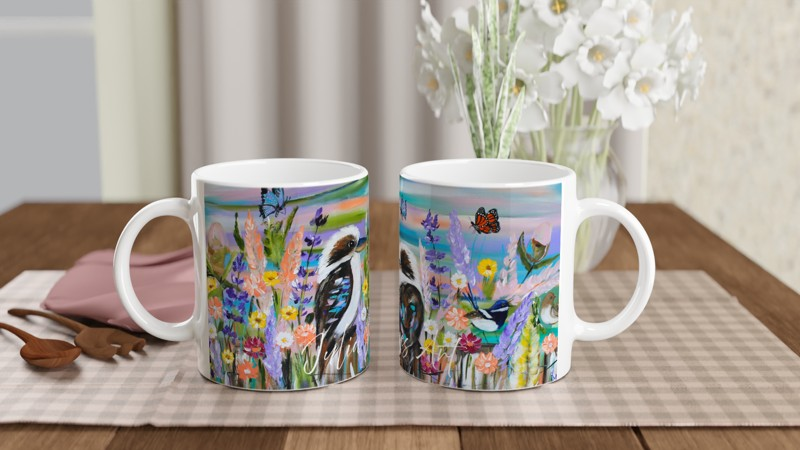 With playful kookaburras perched among a meadow of wildflowers and fluttering butterflies, this design captures the beauty and melody of nature in full bloom. A perfect choice for garden lovers and those who adore a touch of colour and cheer with their morning coffee.
