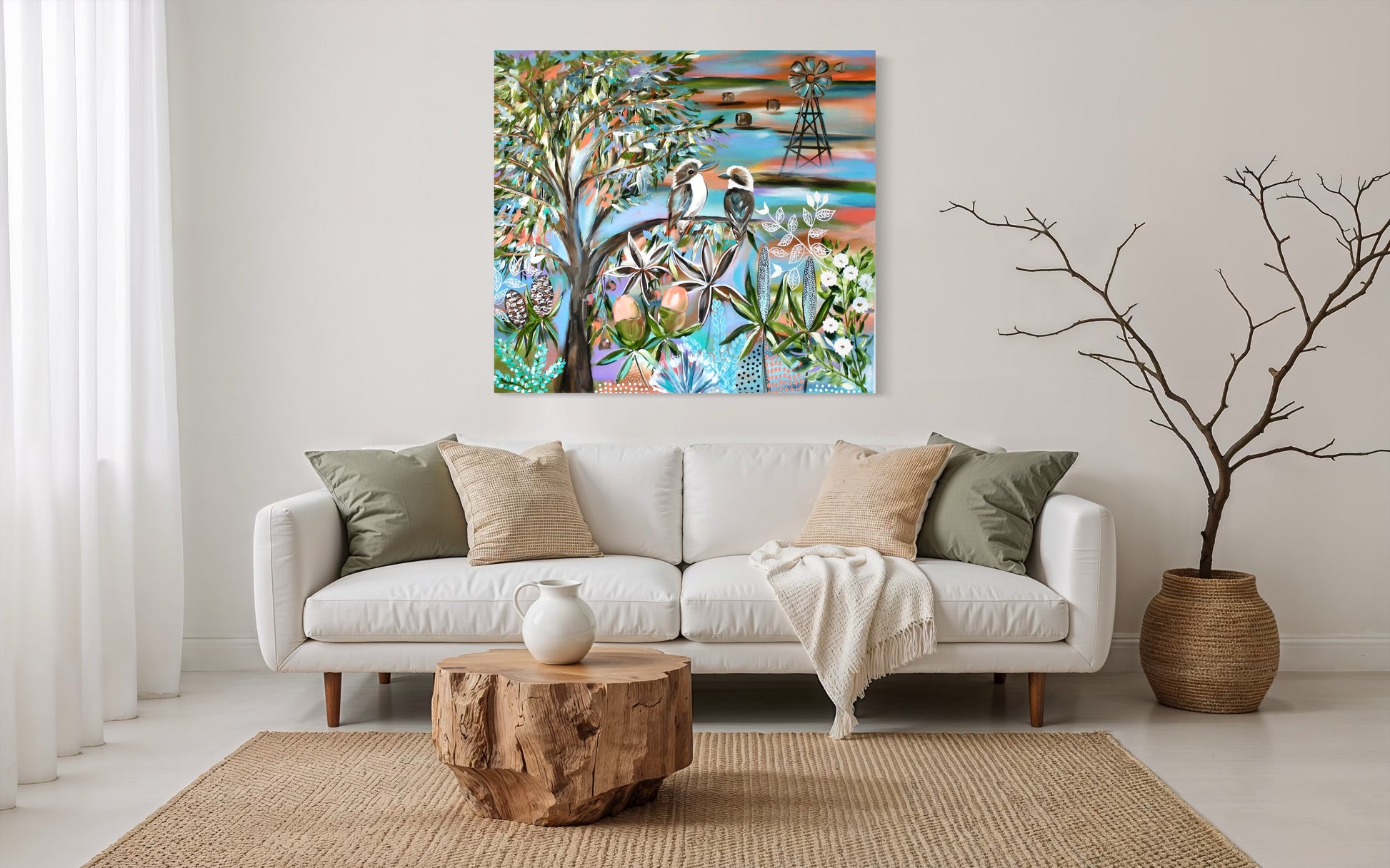 Two kookaburras perch quietly on a gum tree branch, their watchful gaze overlooking rolling fields dotted with hay bales and a rustic windmill standing tall against the horizon. Native florals — from banksia pods to delicate blossoms — frame the foreground in layers of earthy greens, creams, and warm accents. The sweeping sky is alive with vibrant streaks of sunset hues, blending soft blues, oranges, and purples into a radiant, dreamlike backdrop.