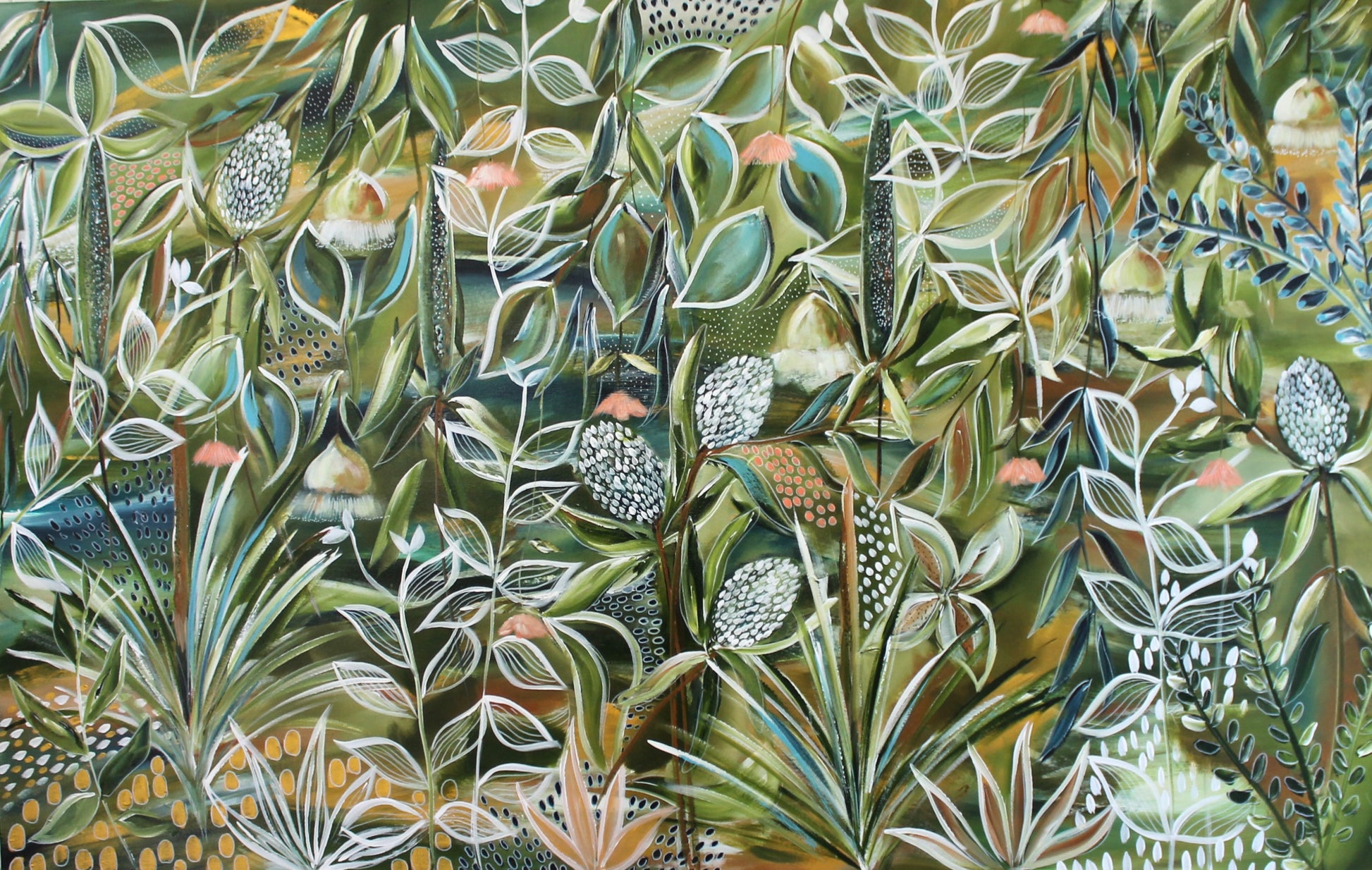 Earthy greens, warm terracottas, muted ochres and soft corals unfold across the canvas, while fine white linework and dot detailing add rhythm and subtle contrast. The composition feels both abundant and serene—like a bushland garden captured in full bloom.