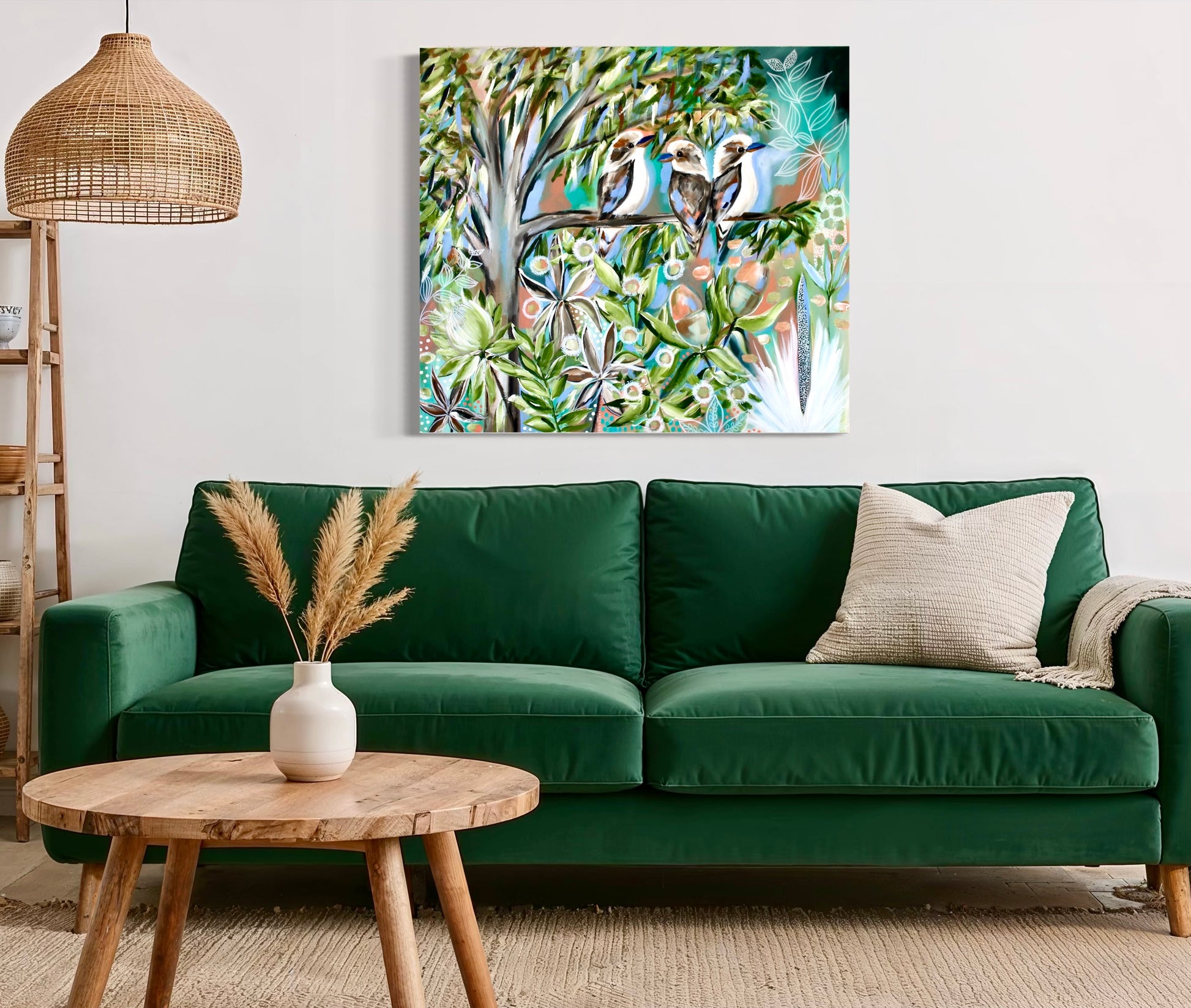 Each brushstroke celebrates the beauty of the Australian bush — from the intricate detailing in the feathers to the abstract floral patterns woven throughout. This piece embodies connection, laughter, and the serenity of nature’s rhythm, making it a stunning statement for any home.
