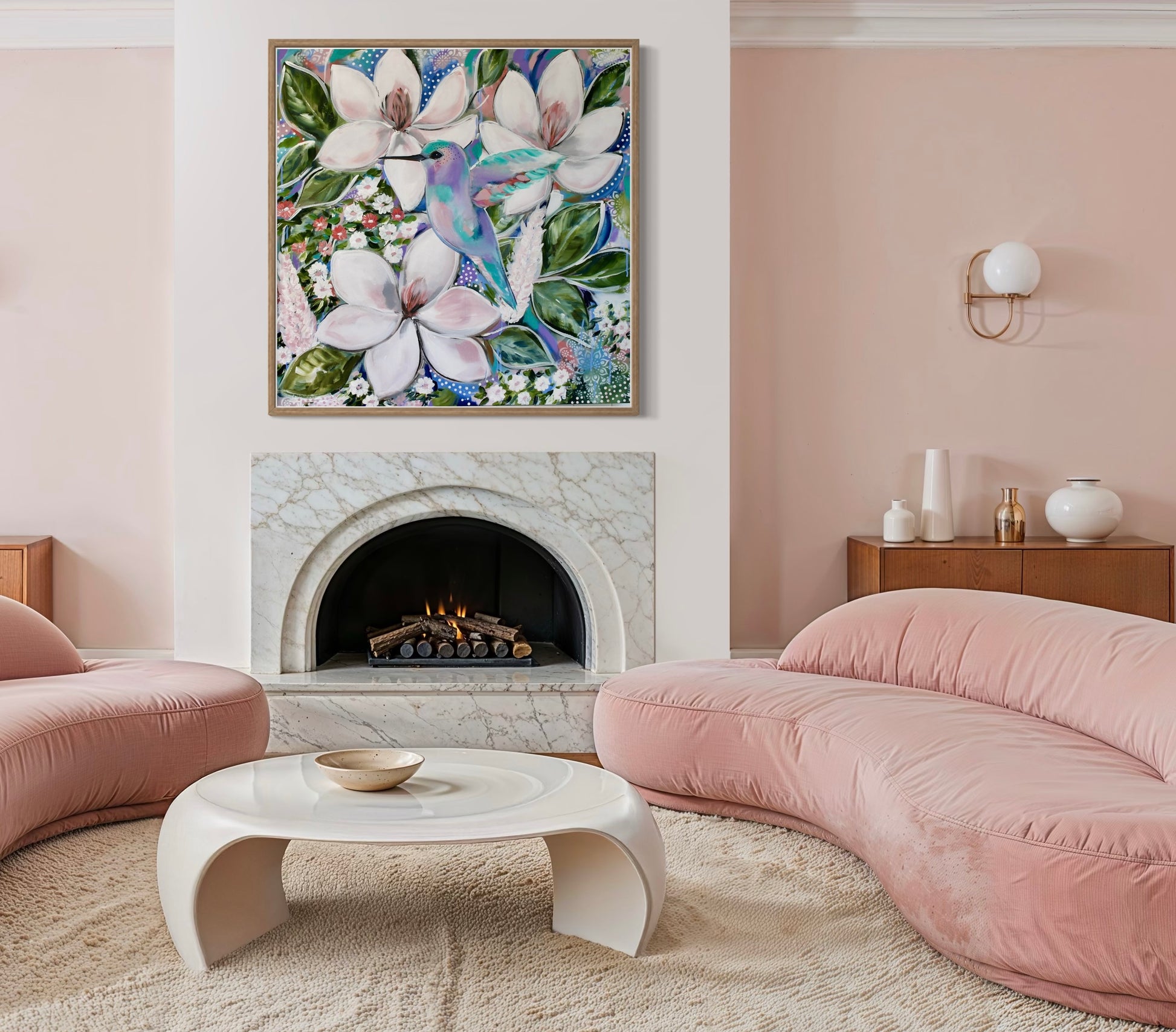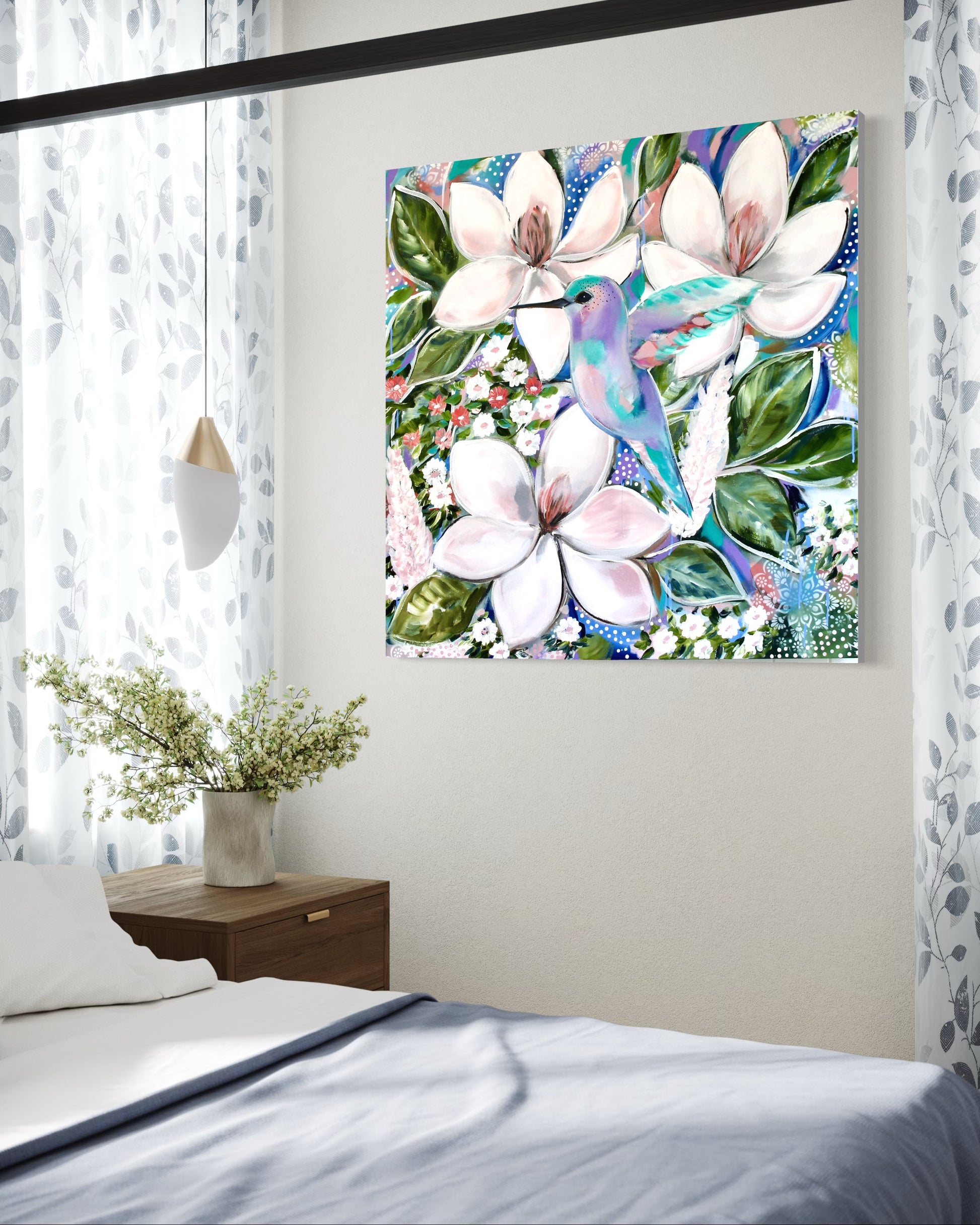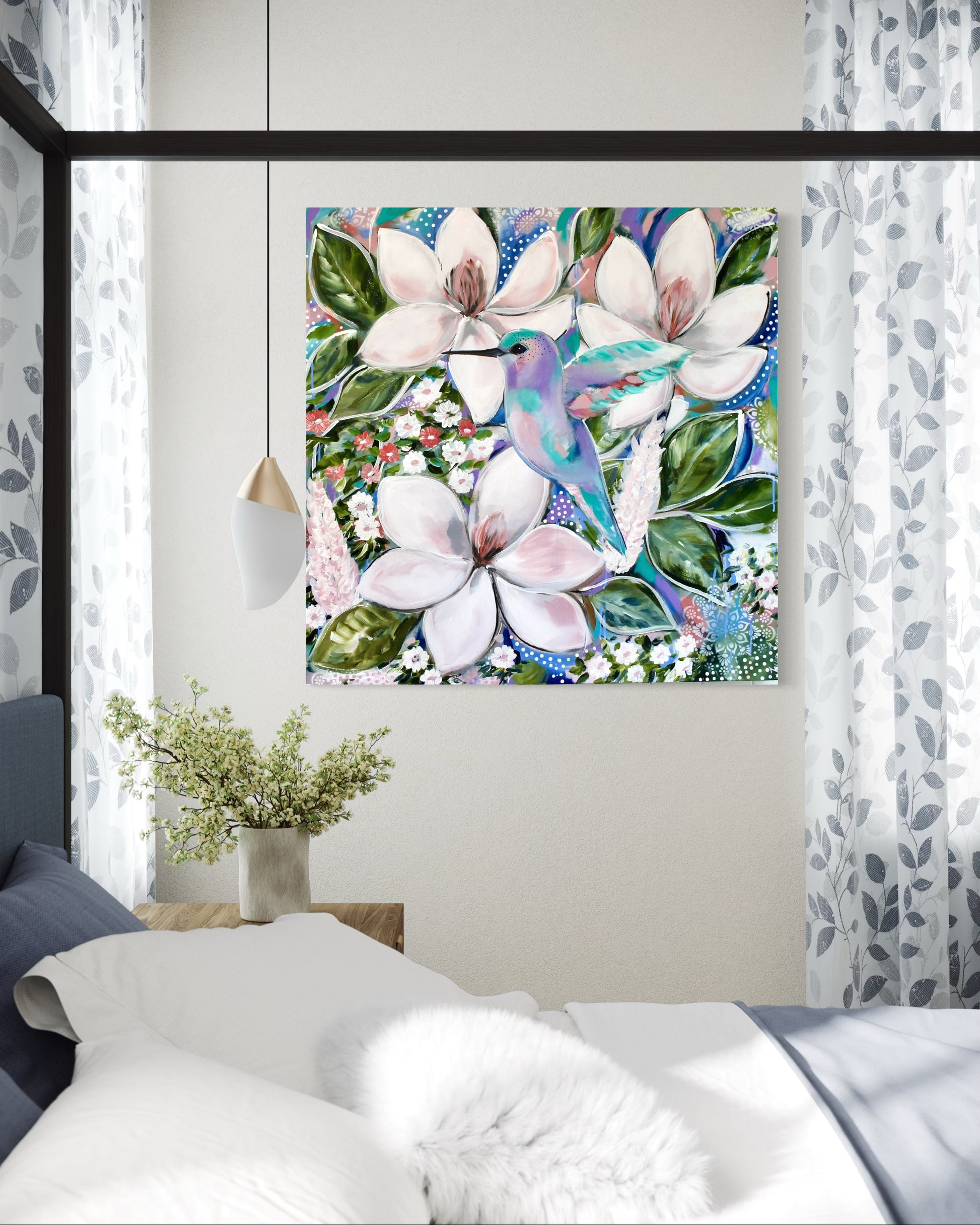 • Medium: Acrylic on canvas with layered botanical and birdlife detailing